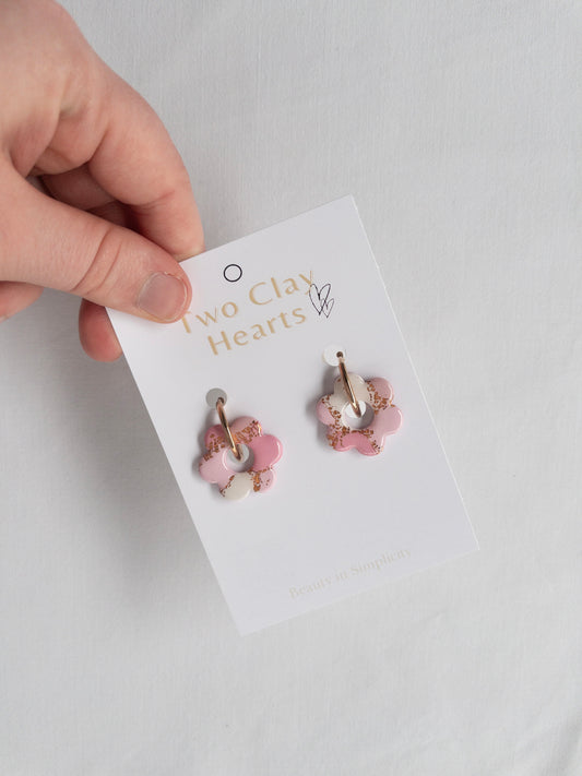 Pink Painted Flower Clay Charm Hoop Earrings